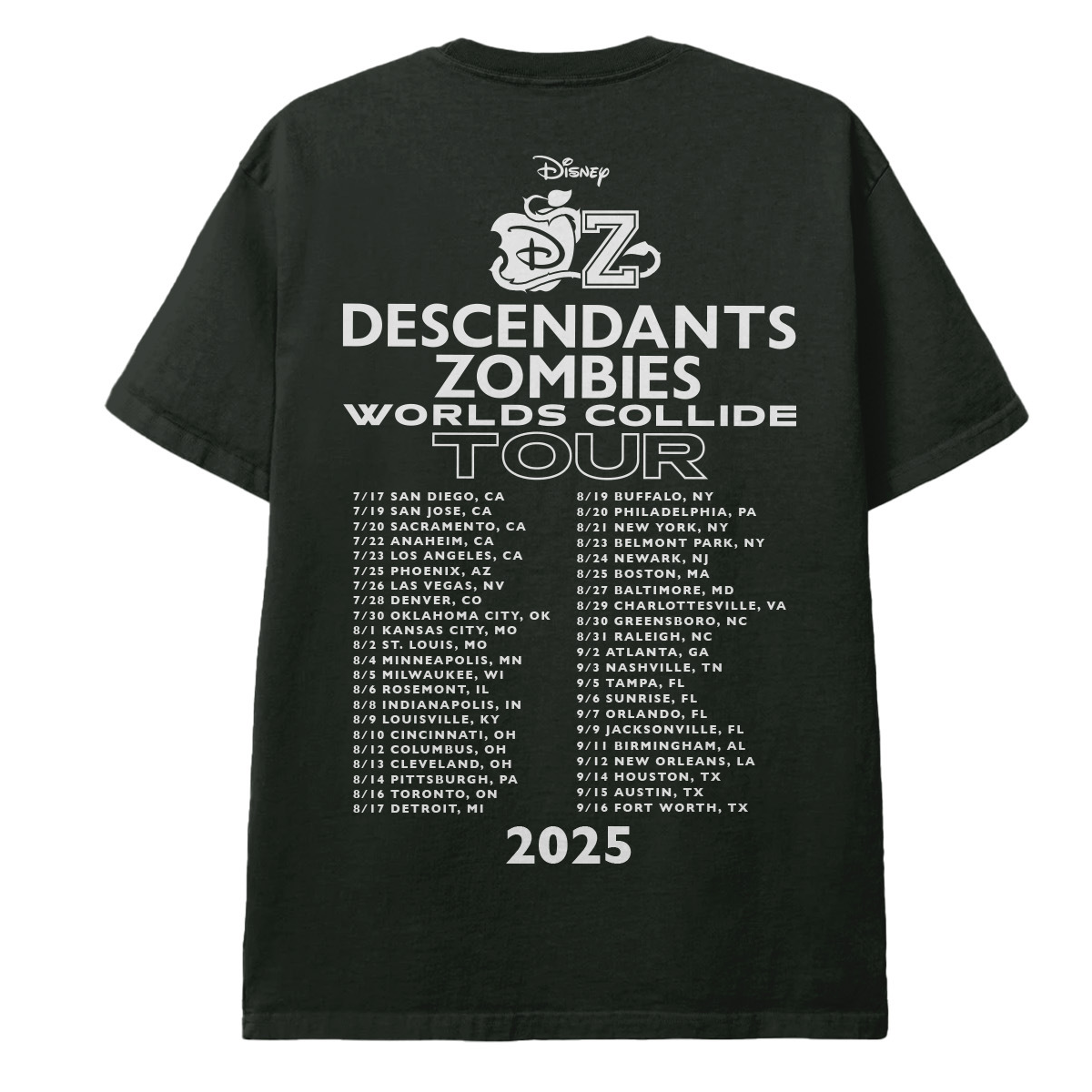 Black 100% cotton short sleeve youth tee with Descendants/Zombies: Worlds Collide Tour artwork on the front. The tour cities are listed on the back.