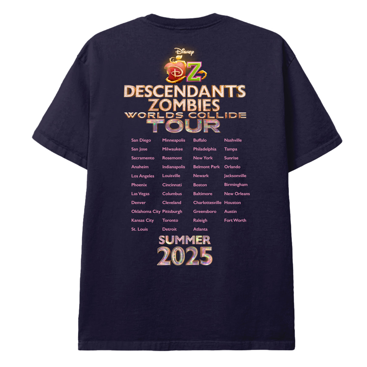 Navy 100% cotton short sleeve youth tee with Descendants/Zombies: Worlds Collide Tour artwork on the front. The tour cities are listed on the back.