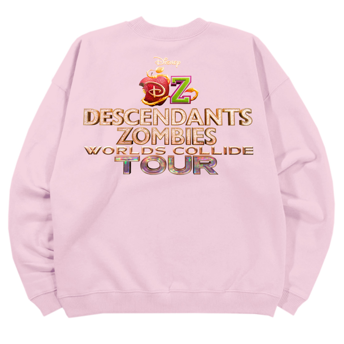 This light pink youth crewneck sweatshirt has a cast photo on the front and the Descendants/Zombies: Worlds Collide Tour logo on the back.